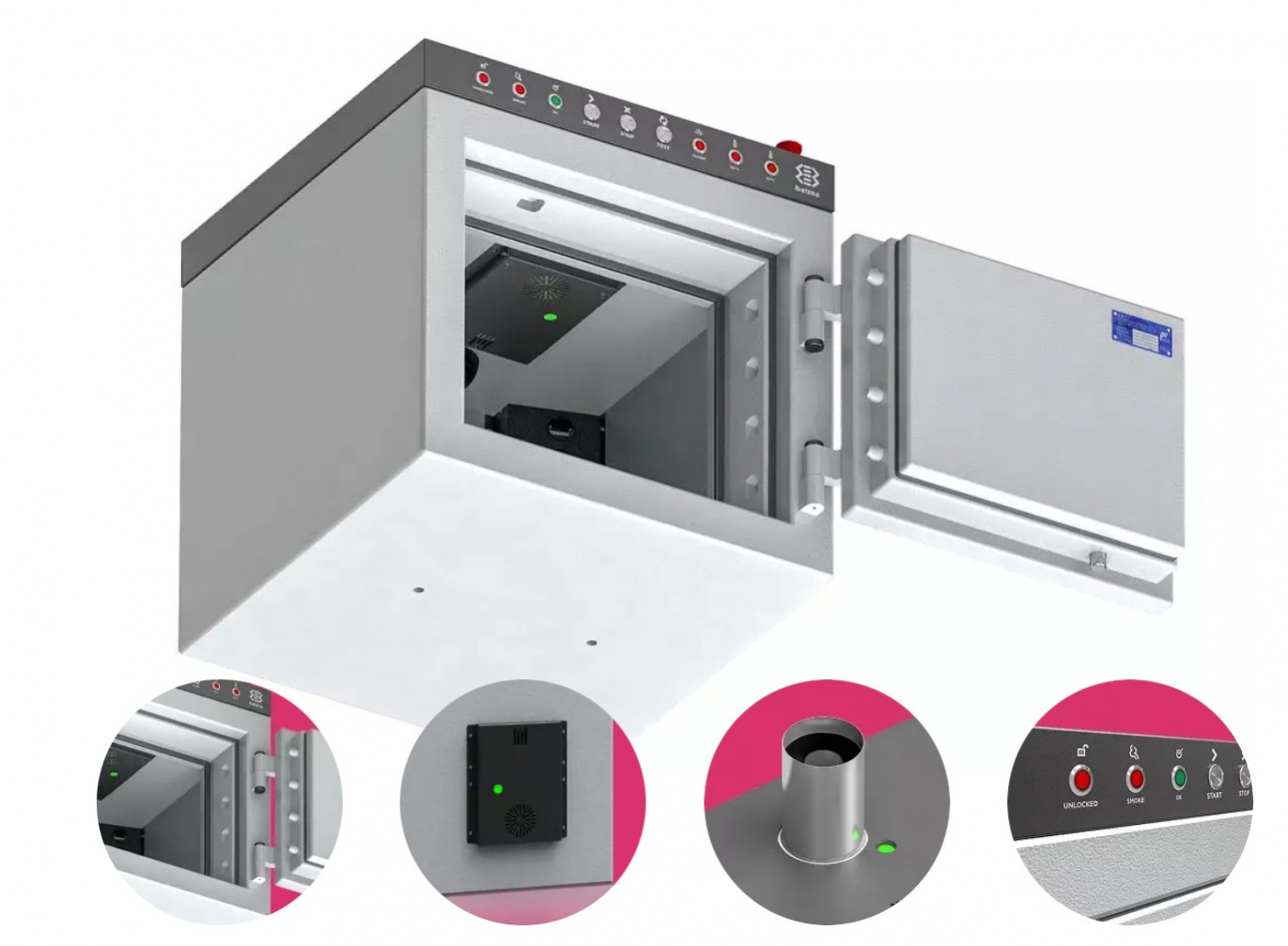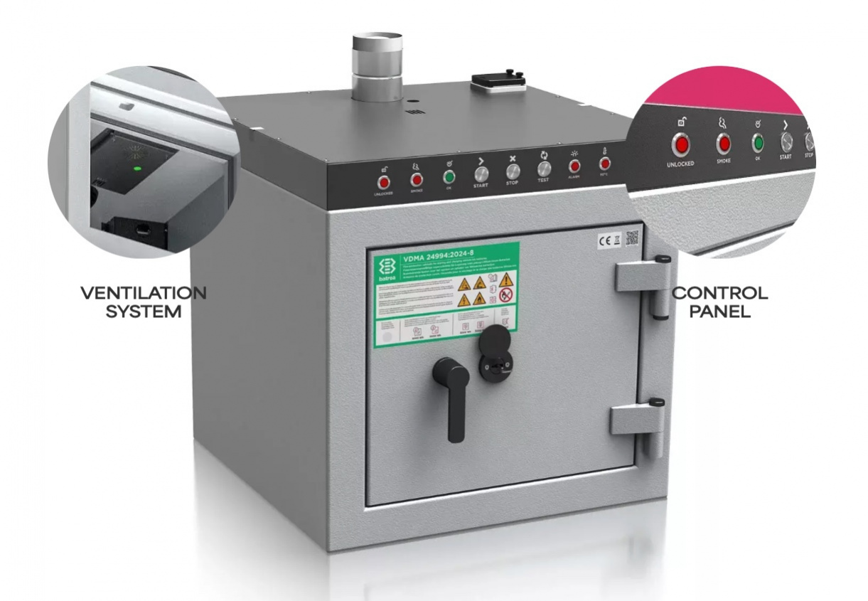 BATREA 鋰離子電池防火櫃可提供全面的防火、防爆與防煙保護。其堅固的鋼製結構、專用密封系統以及智慧型通風系統,即使在最嚴苛的情況下也能確保最高等級的安全性。