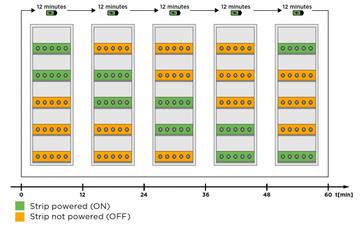 🛢 BATREA 3 櫃體內,有五層層板(每層有5個電源插座),會按順序啟動電源, 每一完整運作週期為 60 分鐘,其中每2層層板插座會以 12 分鐘的間隔依序啟動供電電源,確保充電過程安全且穩定。