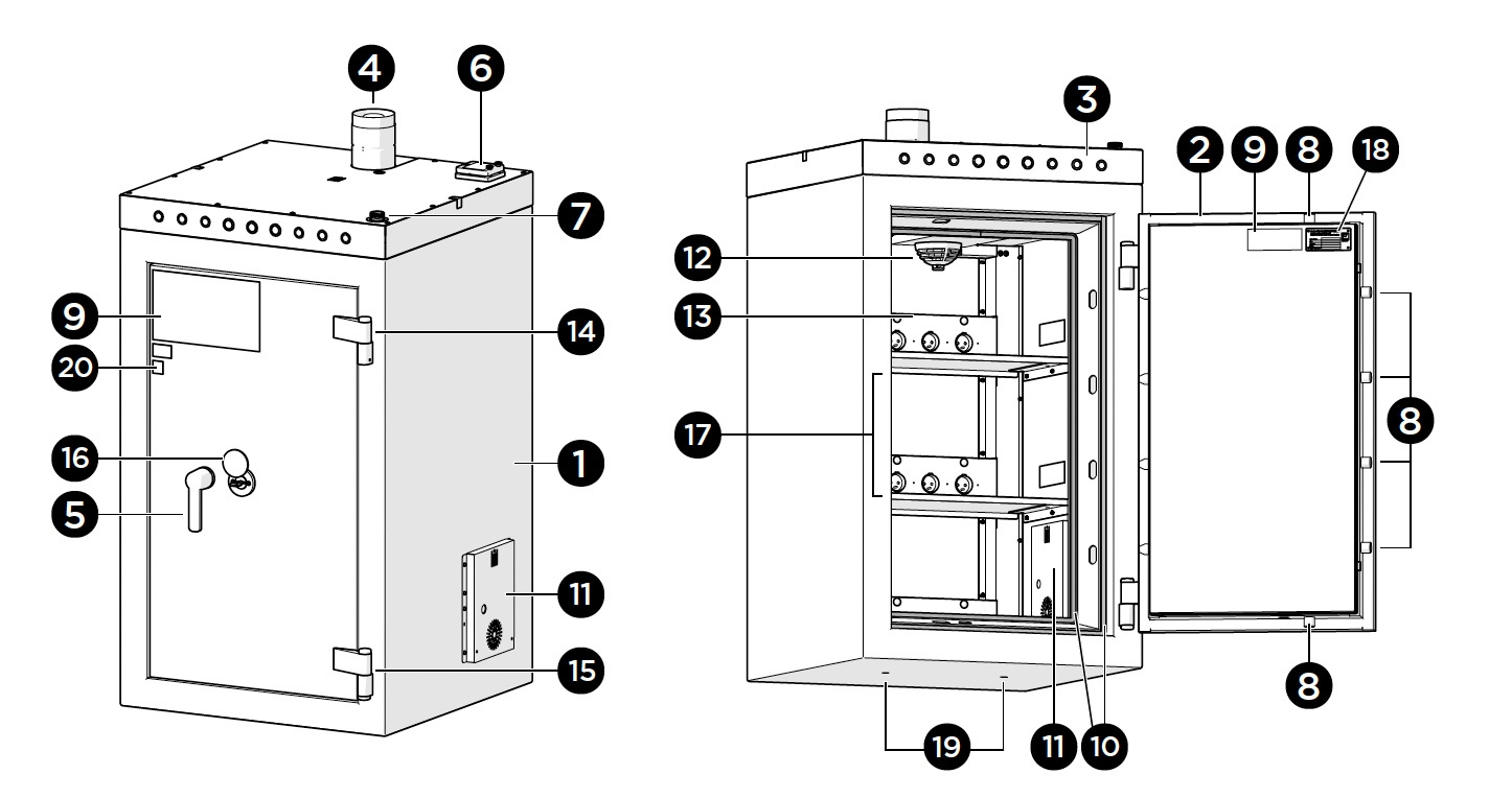 ✔️ 四面門鎖系統 : 強化鎖定機構可防止櫃內發生爆炸時門板被衝開。