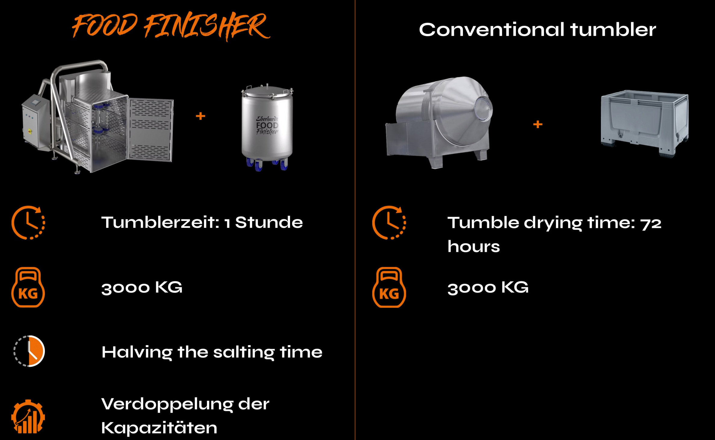 ☑️ 「FOOD FINISHER 子母式真空滾揉筒,採用開放式系統設計,可搭配可互換的不銹鋼 500 公升真空滾揉筒,它的裝填容量高達 85%。如此大的容量意味著即使在長時間停機期間,也無需重新裝料,可以使生產流程更加順暢無虞。」