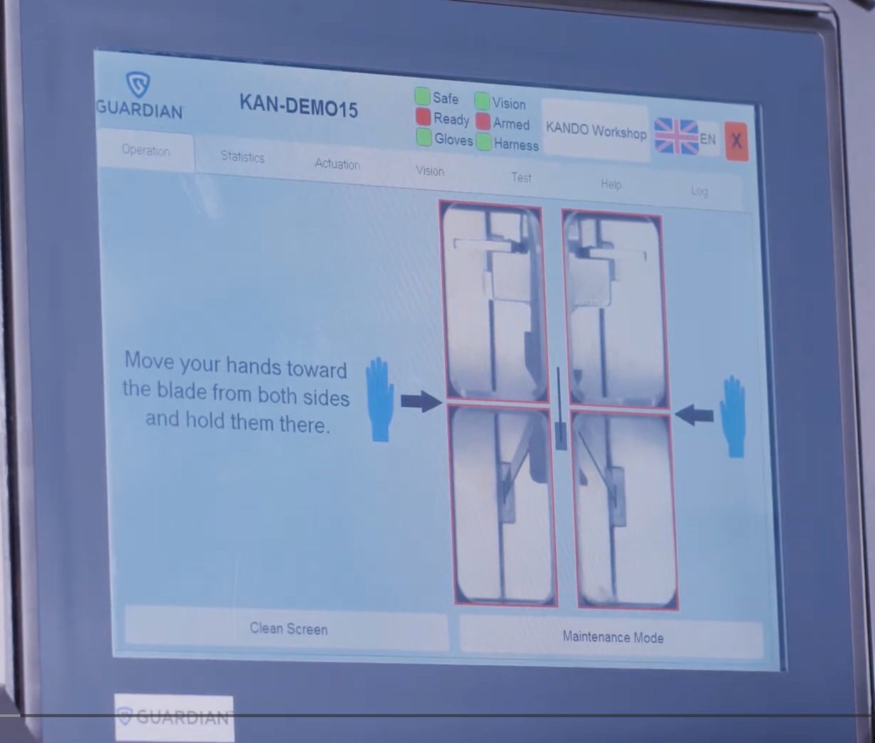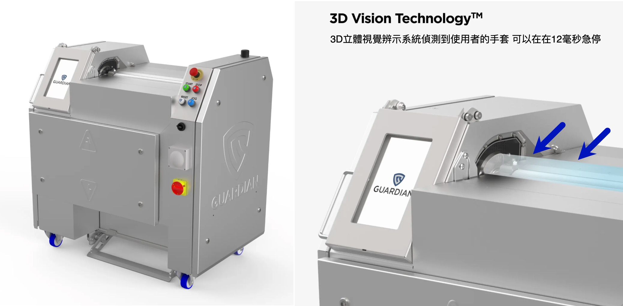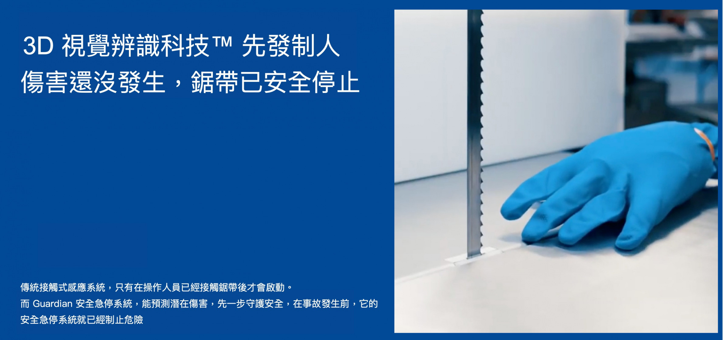 Guardian G系列的帶鋸機採用的安全急停系統,是透過專利的四鏡頭視覺辨識系統,在鋸帶的所有曝露範圍內,建立一個立體三維的安全防護區域。當系統偵測到操作人員配戴的藍色手套進入危險區域(安全防護區域)時,會馬上啟動安全機制,對鋸帶施加煞車,使鋸帶在數毫秒內停止運轉。