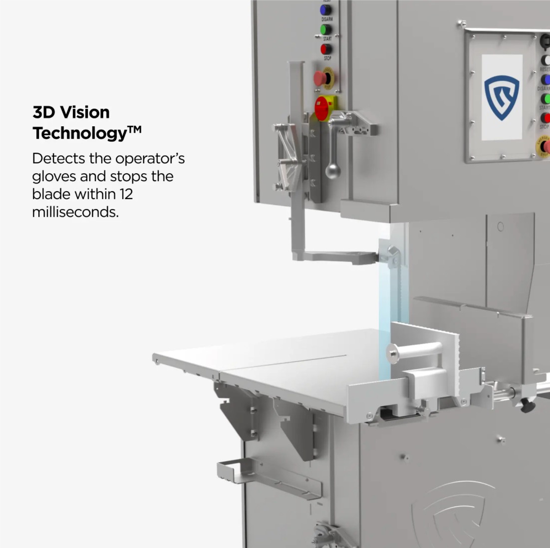 📍 Guardian Bandsaw 採用專利 3D 視覺辨識系統,透過4組鏡頭建立立體三維的安全區域,因此可精準偵測操作人員手部位置,當偵測到潛在危險時,立即啟動高速剎車,瞬間停止鋸帶,將傷害風險降到最低。