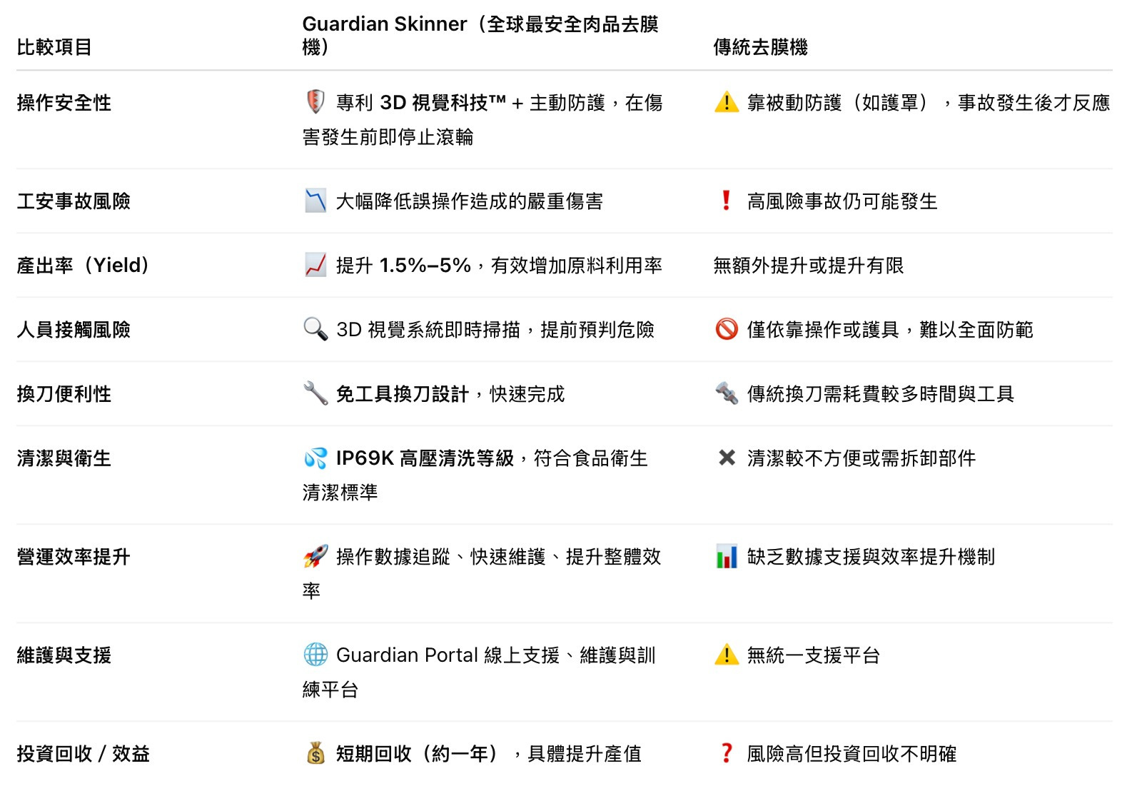 🛡 Guardian Skinner 全球最安全的肉品去皮機 vs 傳統去皮機差異的比較 :