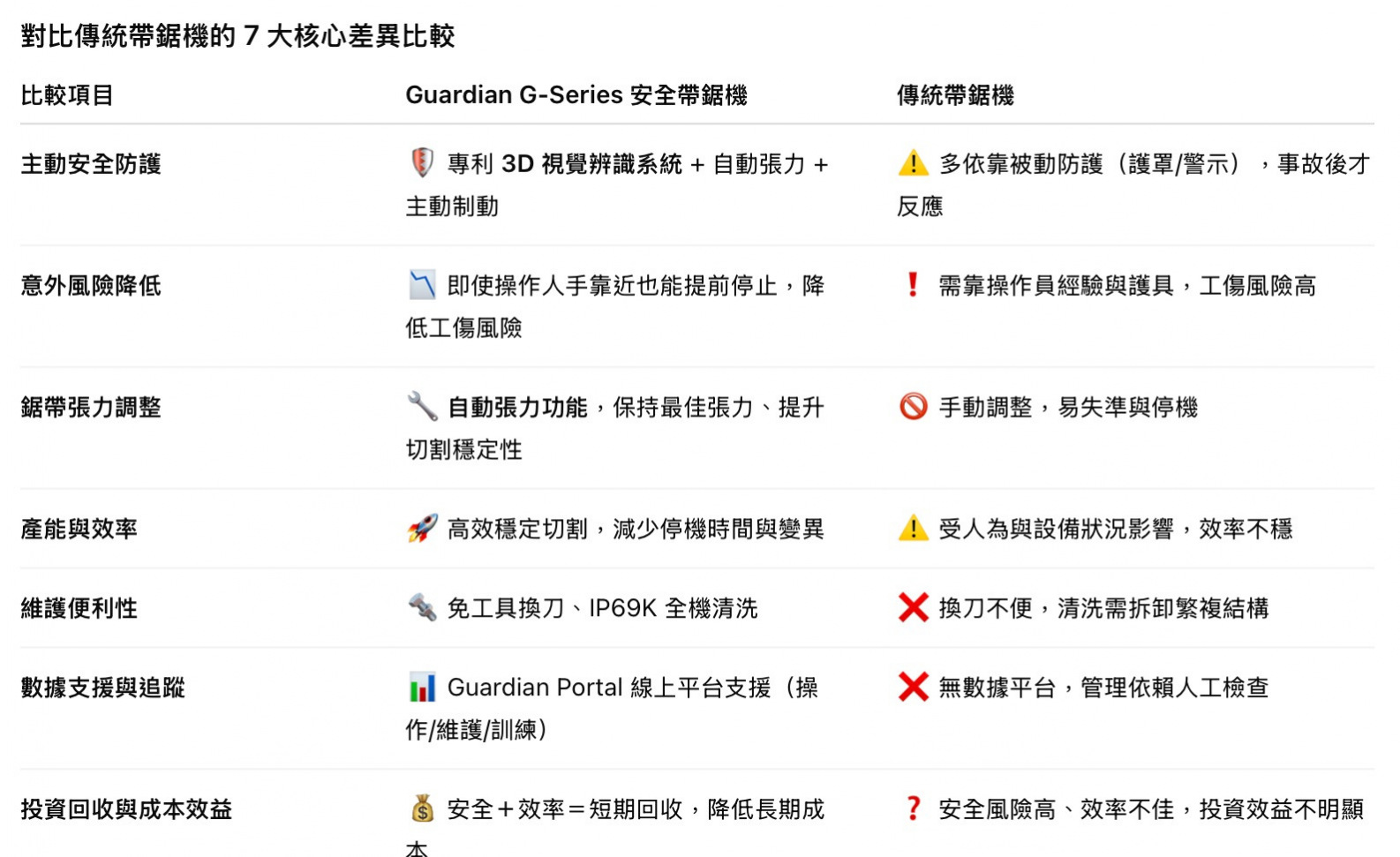🛡 Guardian Bandsaw G系列安全急停帶鋸機 vs 傳統帶鋸機7大核心差異的比較 :