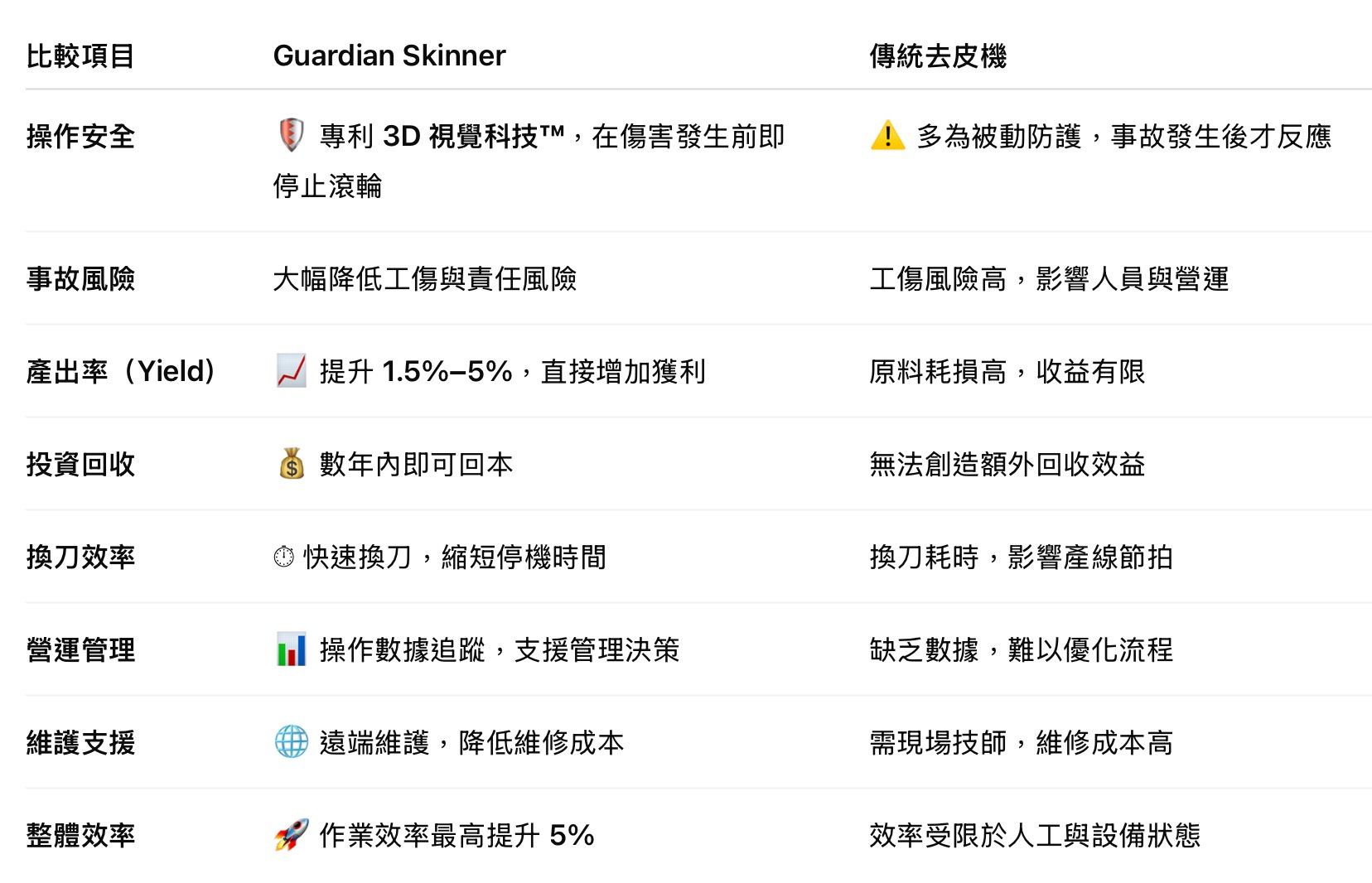 Guardian Skinner 不僅提升工安,更直接為企業創造實際效益。透過精準控制與穩定運作,可提升 1.5% 至 5% 的產出率,讓設備在數年內即可回收投資成本。