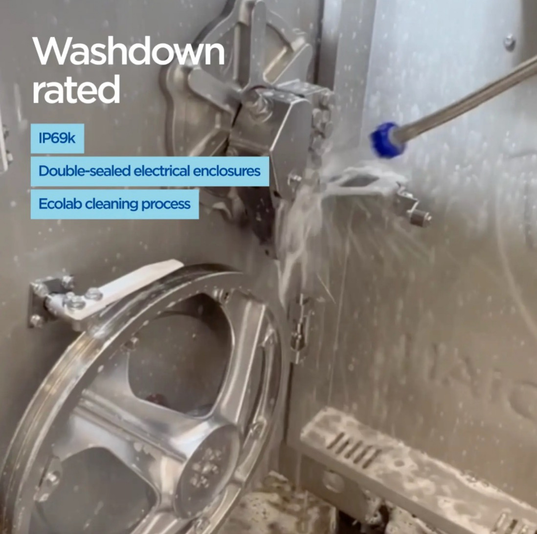 清潔機器只需打開門即可,所有電子元件皆採用 Moisture Guard™ 防護,能承受高壓熱水沖洗。無須拆卸複雜零件,操作簡單又安全。