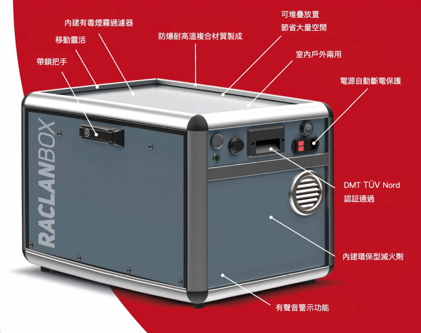 RACLAN 的最新型 RACLAN BOX 是一款新型移動式安全防爆箱,是專門用來對鋰離電池充電和存放的安全防爆箱。