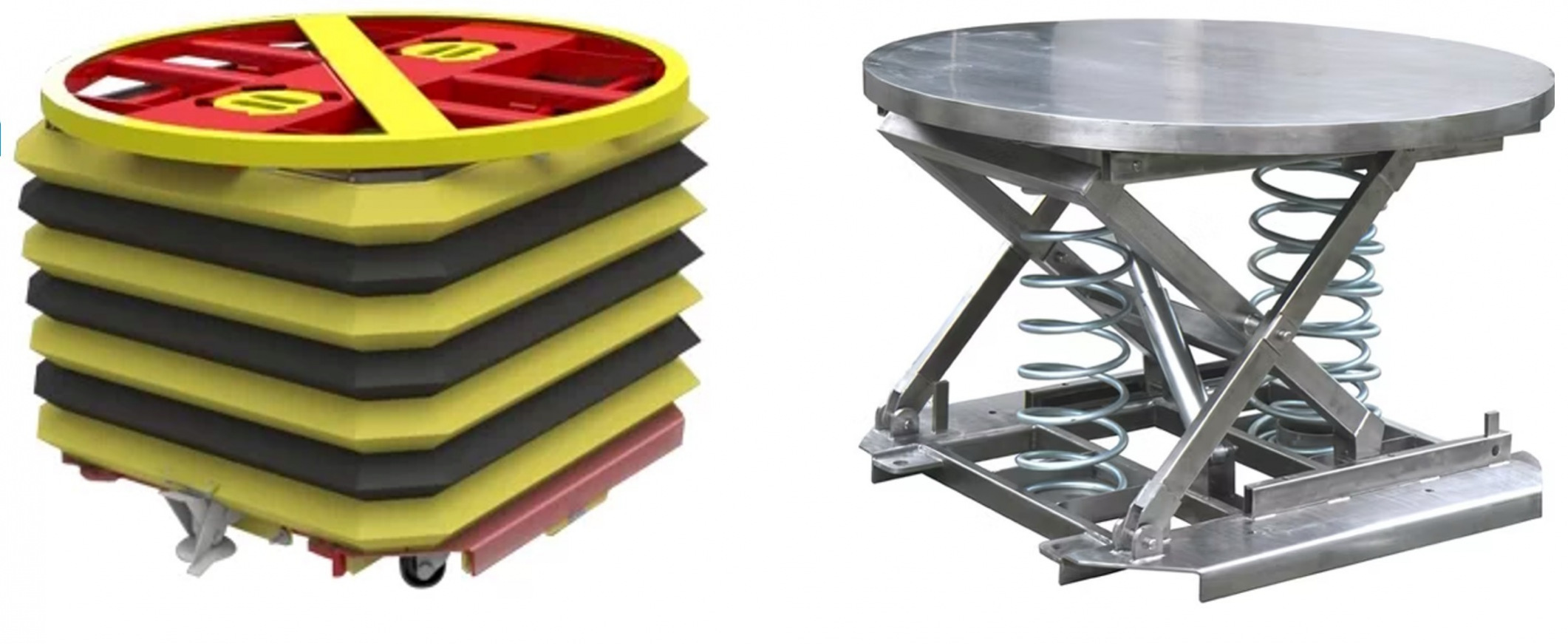 上方的 360° 旋轉平台,讓作業人員可於最接近物件的那一面來輕鬆進行裝卸,減少不必要的移動與伸手/前傾動作,特別適合負載重量變化頻繁的應用場景。系統採用重載型氣囊設計,運作平穩、安全性高、無段調整,同時具備叉車孔設計,方便快速移動設備,並可選配調平腳座,適用於不平整地面。