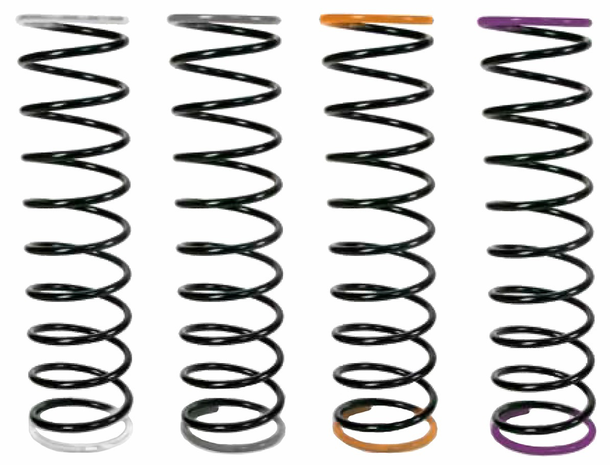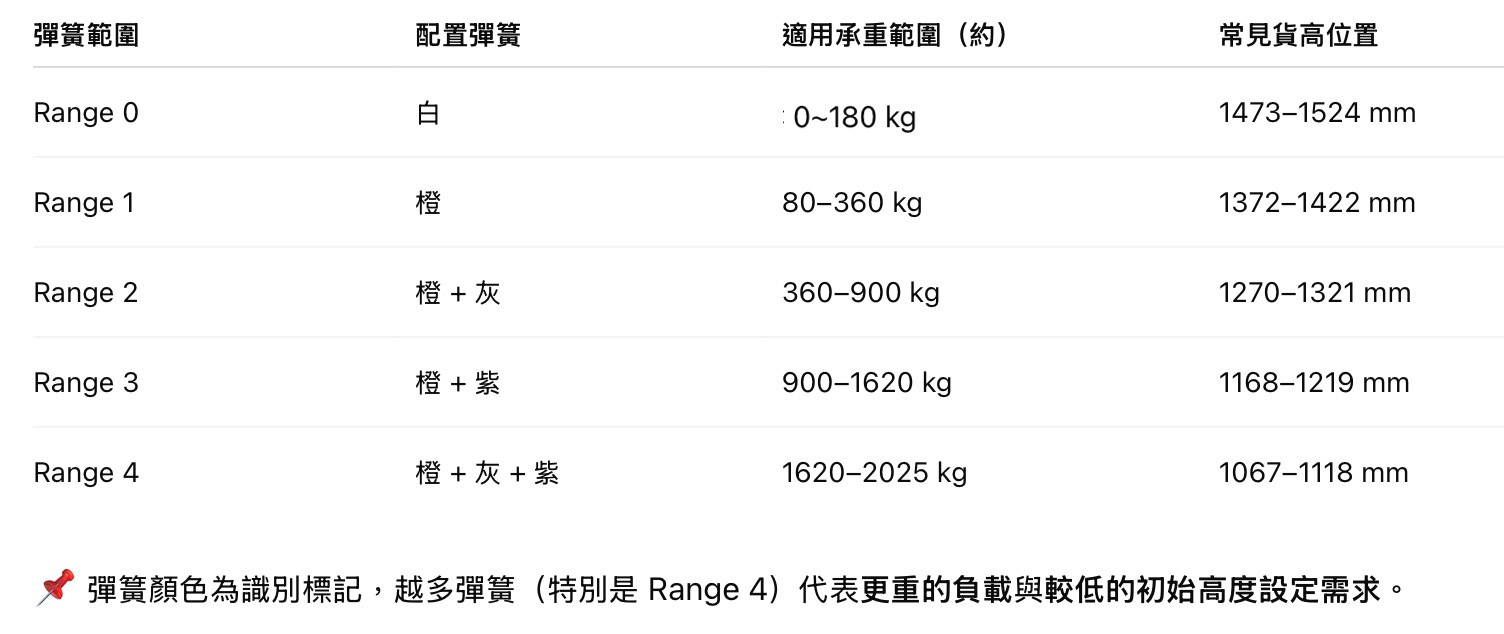 需要搭配棧板總重量(物件數量與包裝大小),有 4 種不同強度的彈簧(白/橙/灰/紫)搭配出5種不同承重範圍可供選擇 :