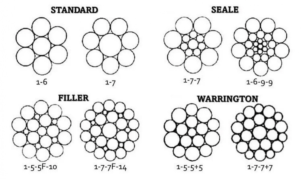 鋼索的結構,依用途分會有不同的層數與捲繞方向 :