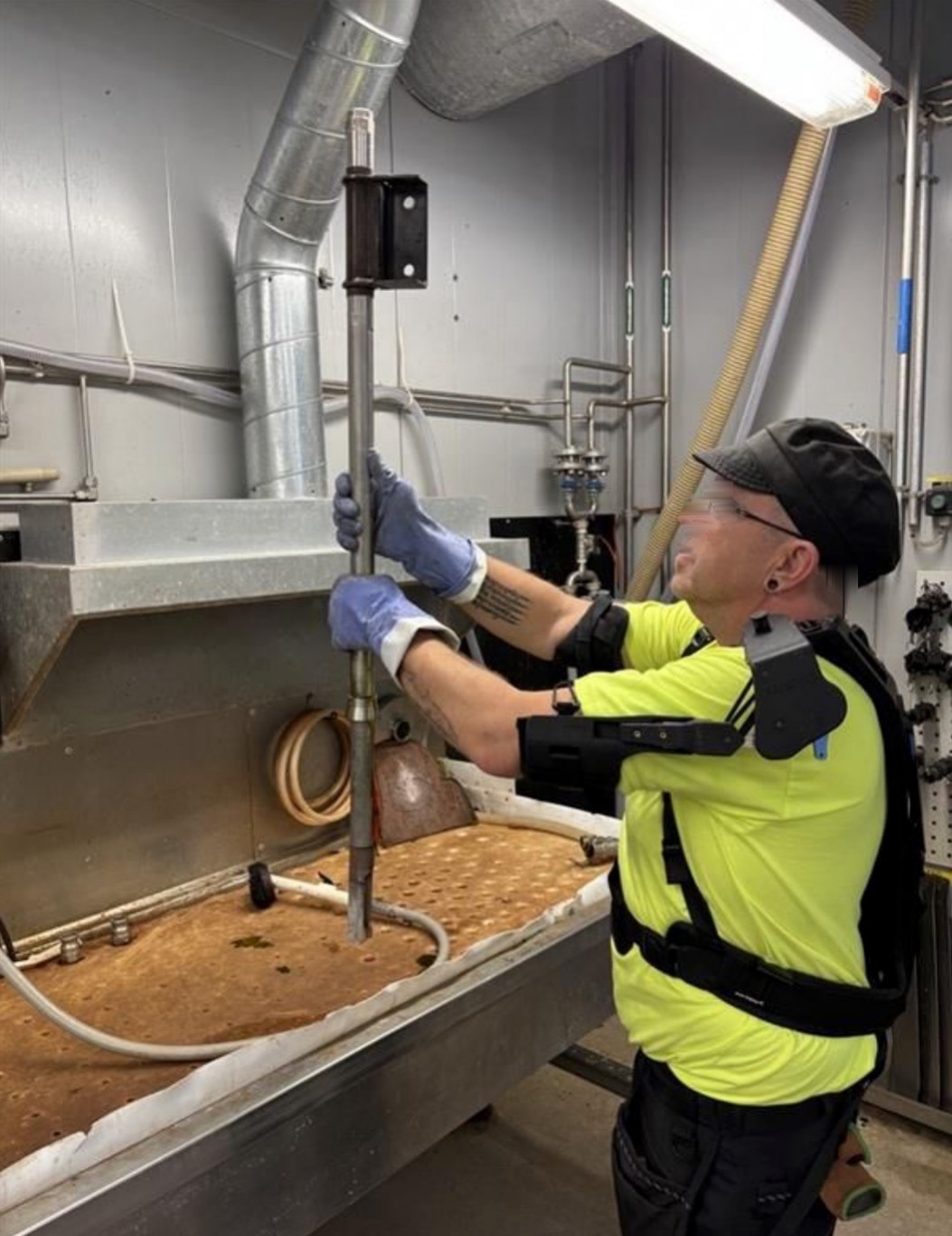 AUXIVO LiftSuit 2.0省力服是市場上唯一一款,可以穿在雨衣裏,(這個應用是要配合手持高壓水柱的水刀作業,作業環境很潮濕),而且不影響正常作業的省力服。當然也可以穿在無塵服/手術服/食品潔淨服…裏。