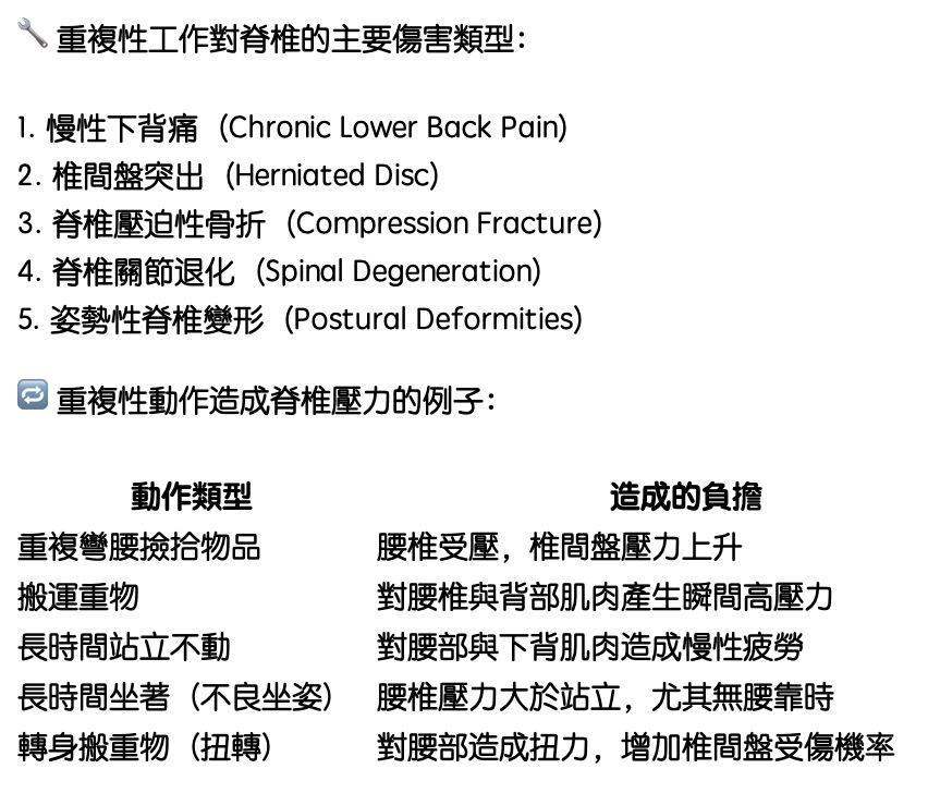 重複性工作對脊椎的傷害是一個常見但經常被忽視的職業健康問題,尤其是在製造、物流、倉儲、建築等需要體力勞動或長時間維持相同姿勢的行業中。
