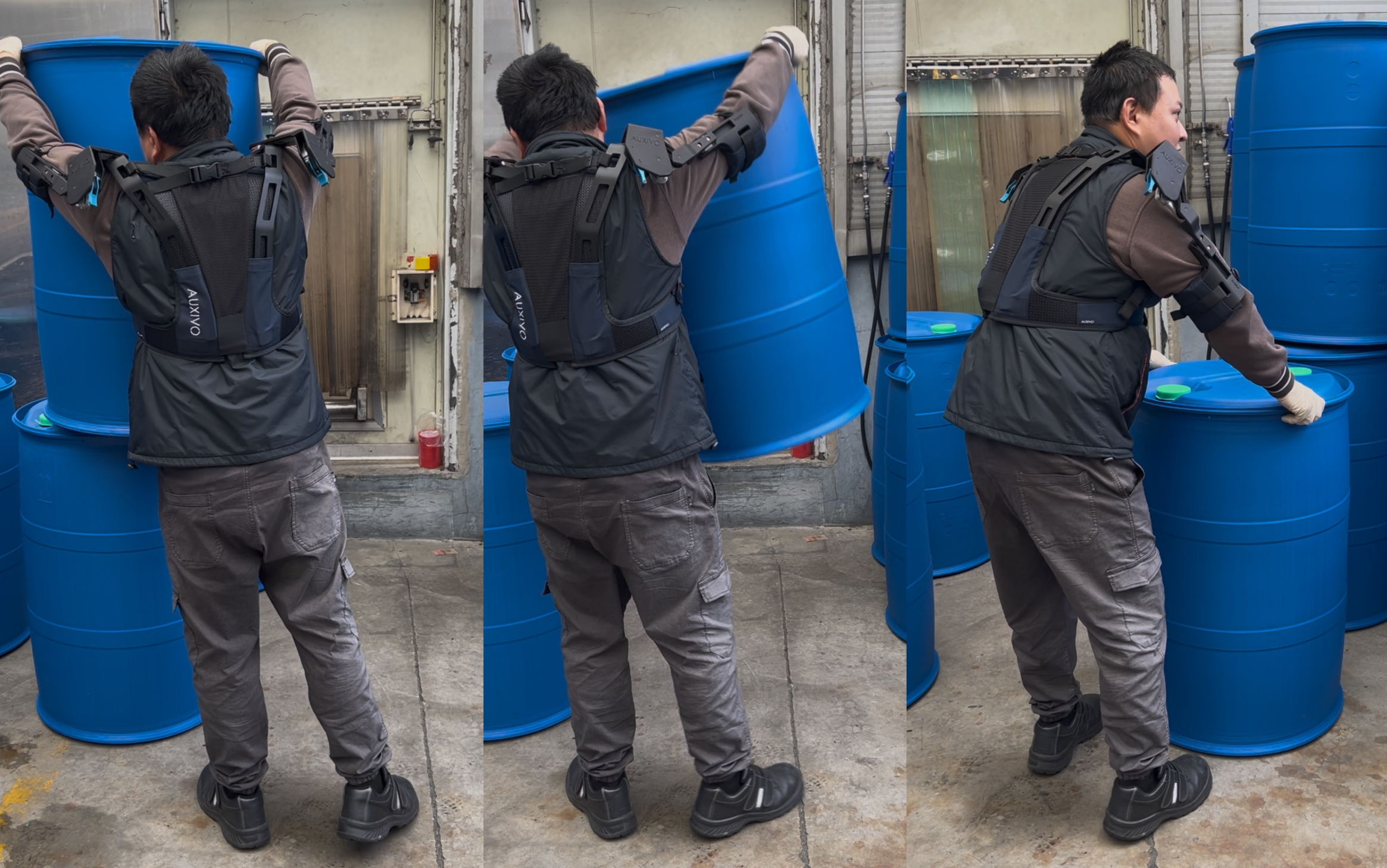 Auxivo DeltaSuit 肩臂省力服 在雲林縣斗六市某化學工廠的應用 ,將化學桶進行堆疊與充填作業。單一化學桶的重量將近10公斤,每天 > 300桶以上的搬運量。