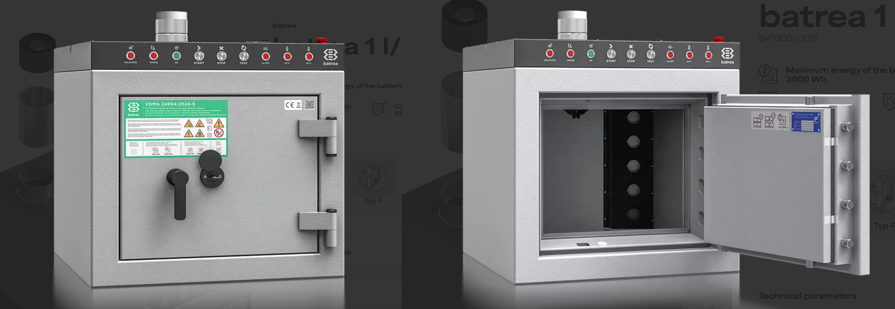 BATREA 鋰離子電池防火櫃可提供全面的防火、防爆與防煙保護。其堅固的鋼製結構、專用密封系統以及智慧型通風系統,即使在最嚴苛的情況下也能確保最高等級的安全性。