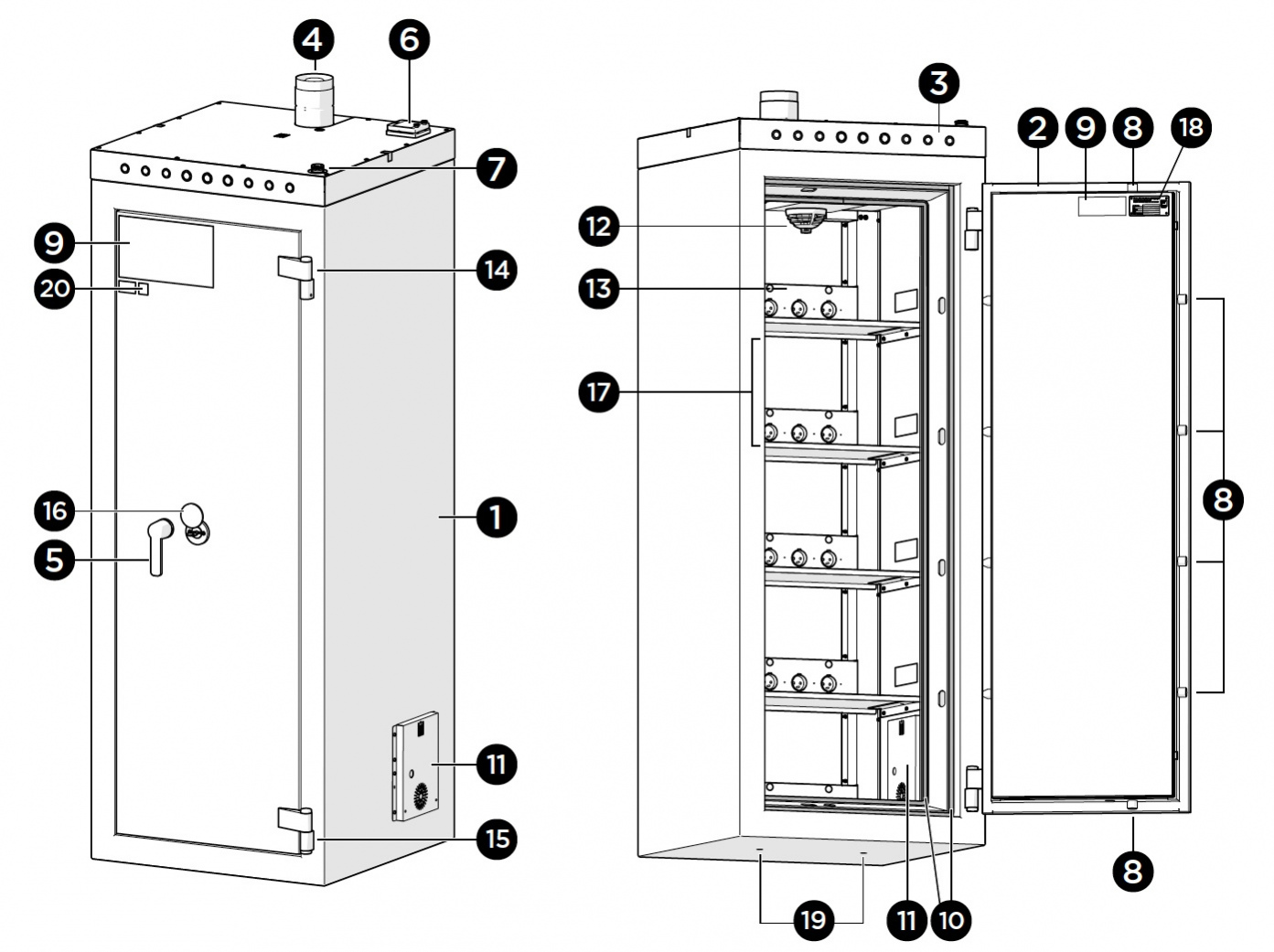 ✔️ 四面門鎖系統 : 強化鎖定機構可防止櫃內發生爆炸時門板被衝開。
