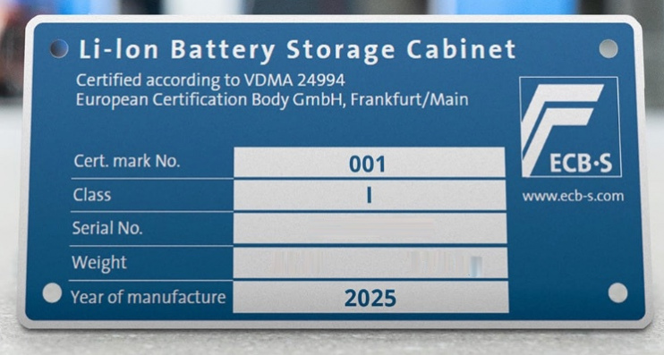這是一座用於鋰電池的儲存與充電的防爆安全櫃,這座防爆安全櫃已通過 VDMA 指南 24994:2024-08 認證為 Class I/O30 鋰電池防爆儲存安全櫃。這個認證是由獨立第三方認證機構所頒發,並由 ECB•S 認可的合作夥伴進行測試。