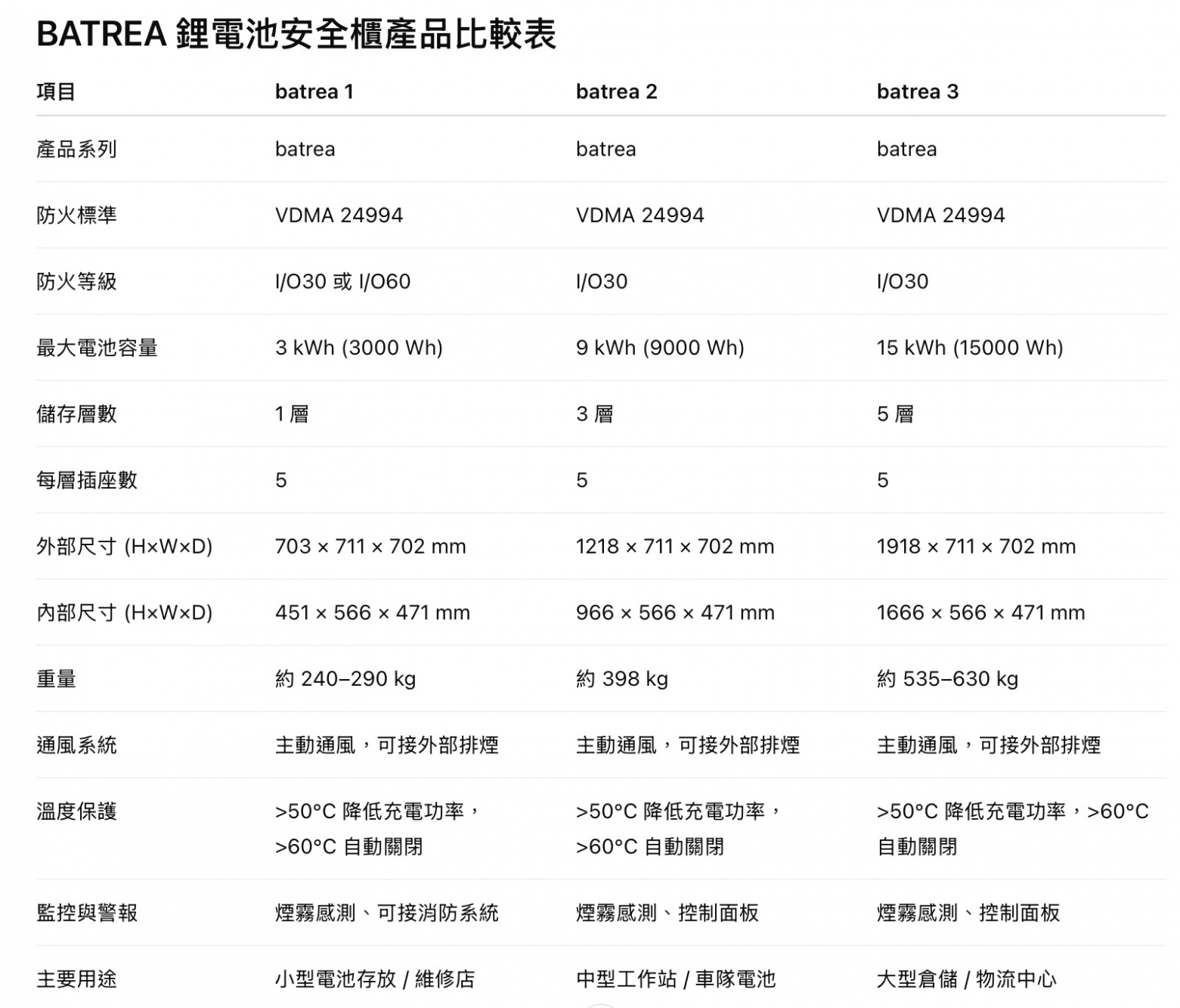 🔋 BATREA 3 系列鋰電池防爆安全櫃 外形尺寸與重量 :