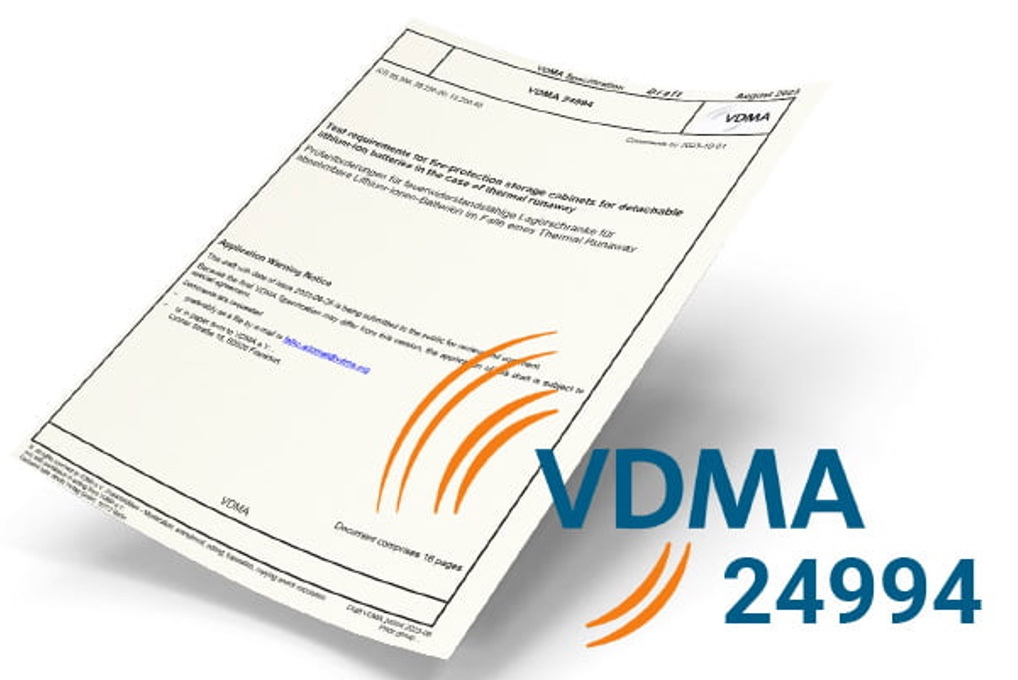 隨著鋰離子電池在工業、物流與能源領域的大量使用,傳統的化學行業所使用防火櫃標準已逐漸無法完全涵蓋鋰電池帶來的特殊風險。因此,新的 VDMA 24994 鋰電池儲存櫃指南被提出,用於專門評估鋰電池儲存櫃的安全性。