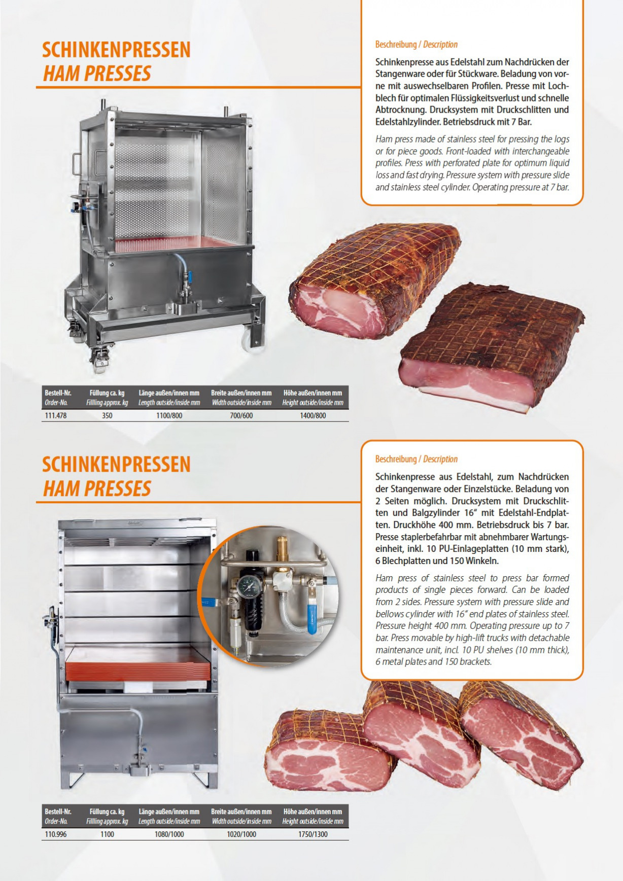 無論是 AIR MAX FOOD PRESS氣壓式塑型機、螺桿式塑型機 (spindle cooking presses)、香腸或火腿壓製設備,我們的系統都能提升客戶的生產效率。零星切片的損失率明顯降低,所需要的原料減少約 20%,同時提高產量並減少蛋白質浪費——這對珍貴的食品而言相當重要。所有 FOOD PRESS SYSTEMS® 均以卓越技術水準打造,始終堅持德國製造,高品質一貫如初,並以客戶的成功為核心設計理念。