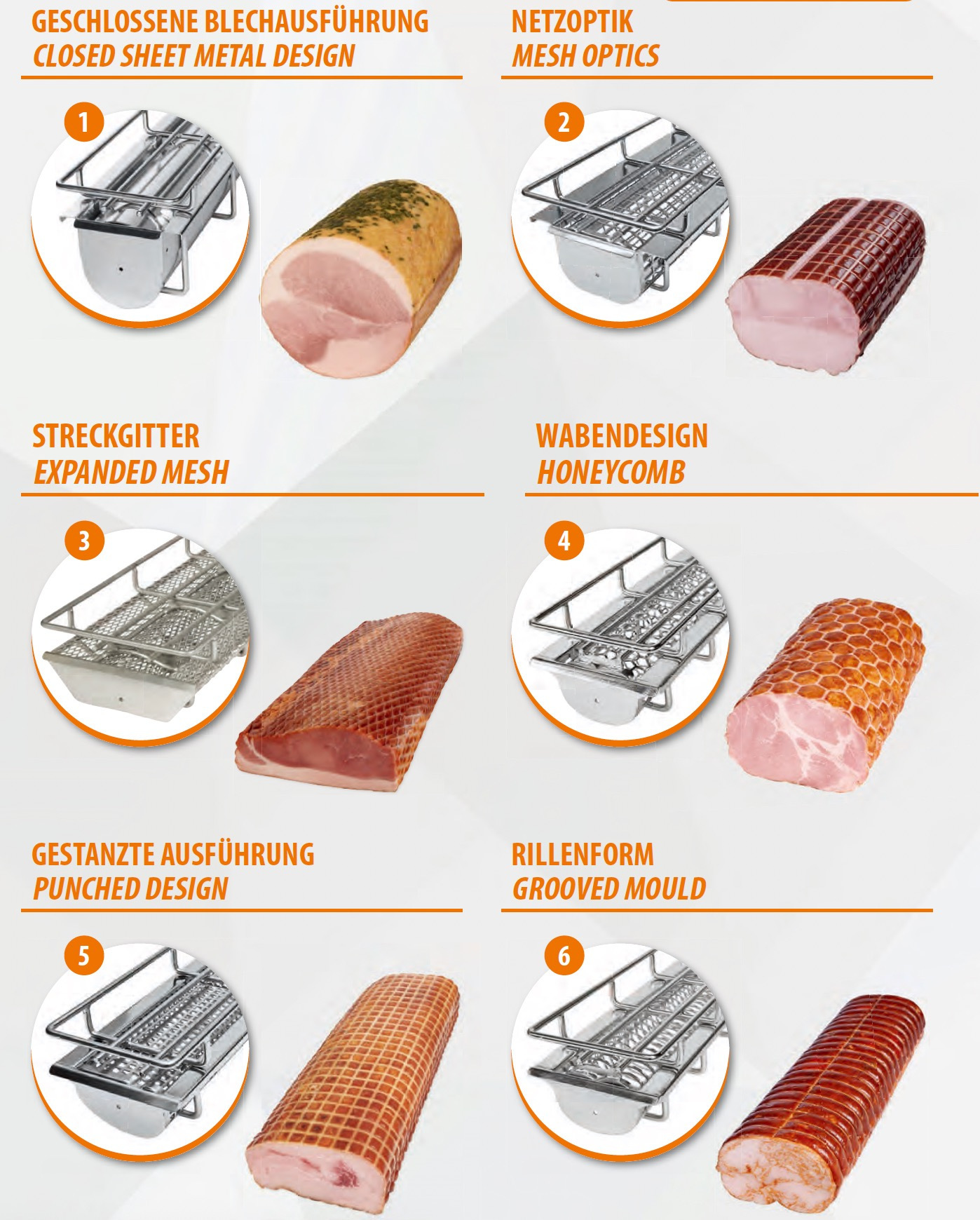 在 Eberhardt,我們重視形狀多樣性 (Formenvielfalt / Variety of Forms)。憑藉我們豐富的模具與幾何造型,超過100種不同形狀與長度的選擇,您可依照產品需求來挑選,我們也接受訂製客製化的產品:例如愛心形香腸、葫蘆型狀火腿、或任何您的創意設計的造型。