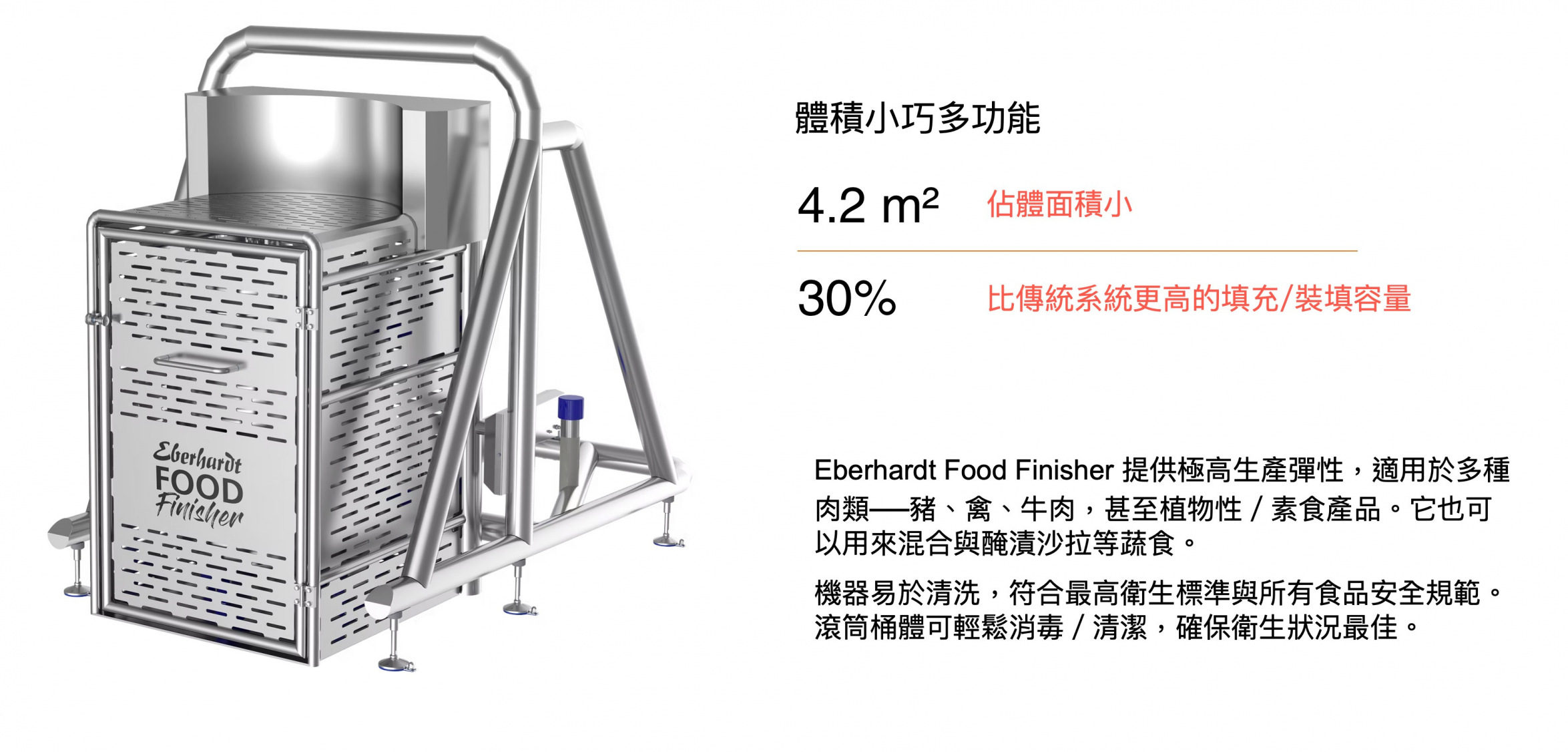 Eberhardt Food Finisher 是現代化食品加工的最佳夥伴,讓你的產品更好、產能更高、成本更低。會是改變你熟肉與滷煮製品的顛覆性關鍵武器。