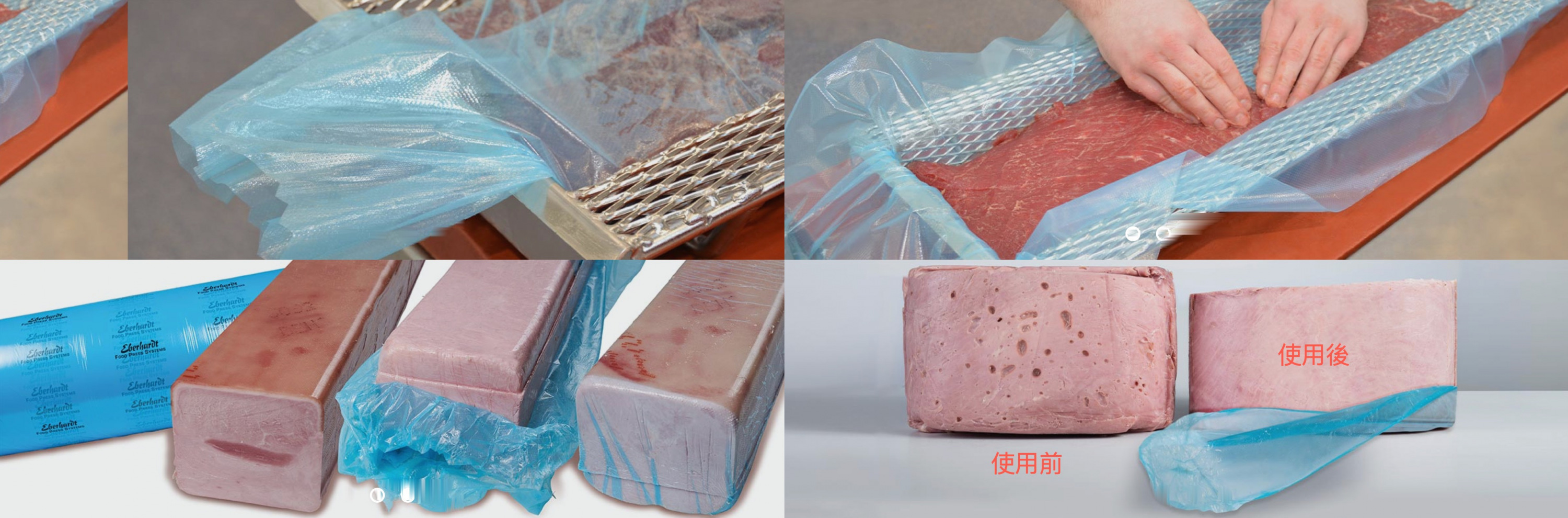Eberhardt 包裝膜 (Film):專為熟火腿和生火腿設計。對於熟火腿,包裝膜能與肉的表皮 緊密貼合,通過壓製快速排出空氣,避免內部氣孔形成,不需額外真空抽去空氣。對於生火腿,包裝膜可加速水分移動到表面,使產品保持可呼吸性、防止變質並加速脫水。這樣可提升最終產品品質與穩定性。