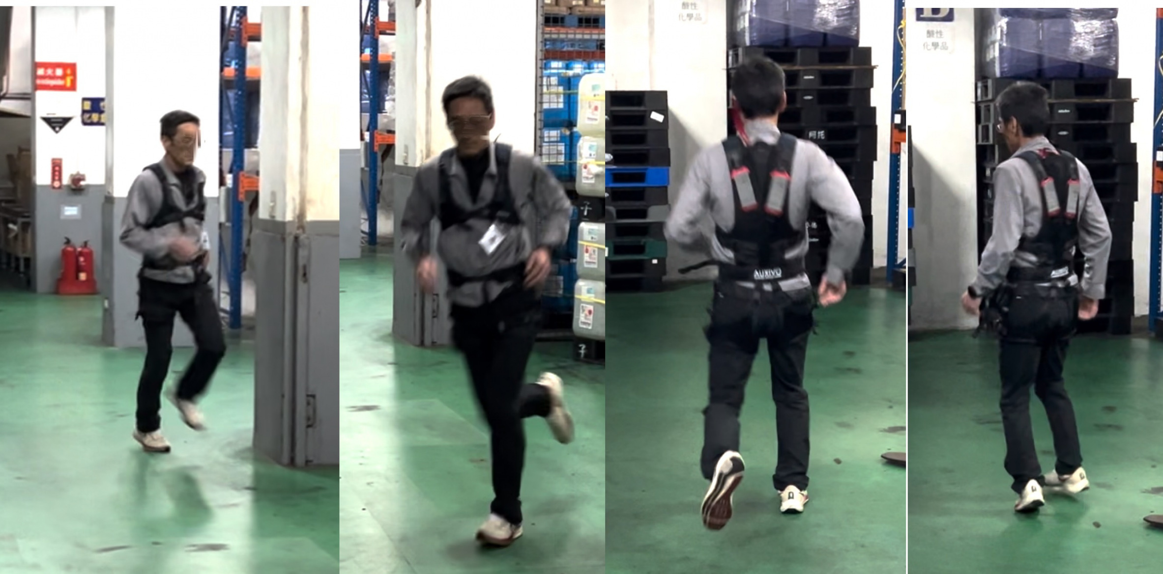 AUXIVO LiftSuit 2.0省力服是市場上唯一一款,穿著省力服可以快速跑步/上下樓梯/緊急迴旋/閃躲。照片中是中壢某上市電子公司環安經理親自穿著省力服進行不同測試項目的過程。進行這些不同測試項目的目的,主要是要確定讓省力服的使用者,能夠在遇到緊急狀況(例如 : 火警/地震/機器固障/恐怖事件…),穿著省力服不會影響身體動作,也不用脫掉省力服(緊急時分秒必爭),就能夠快速逃離現場。