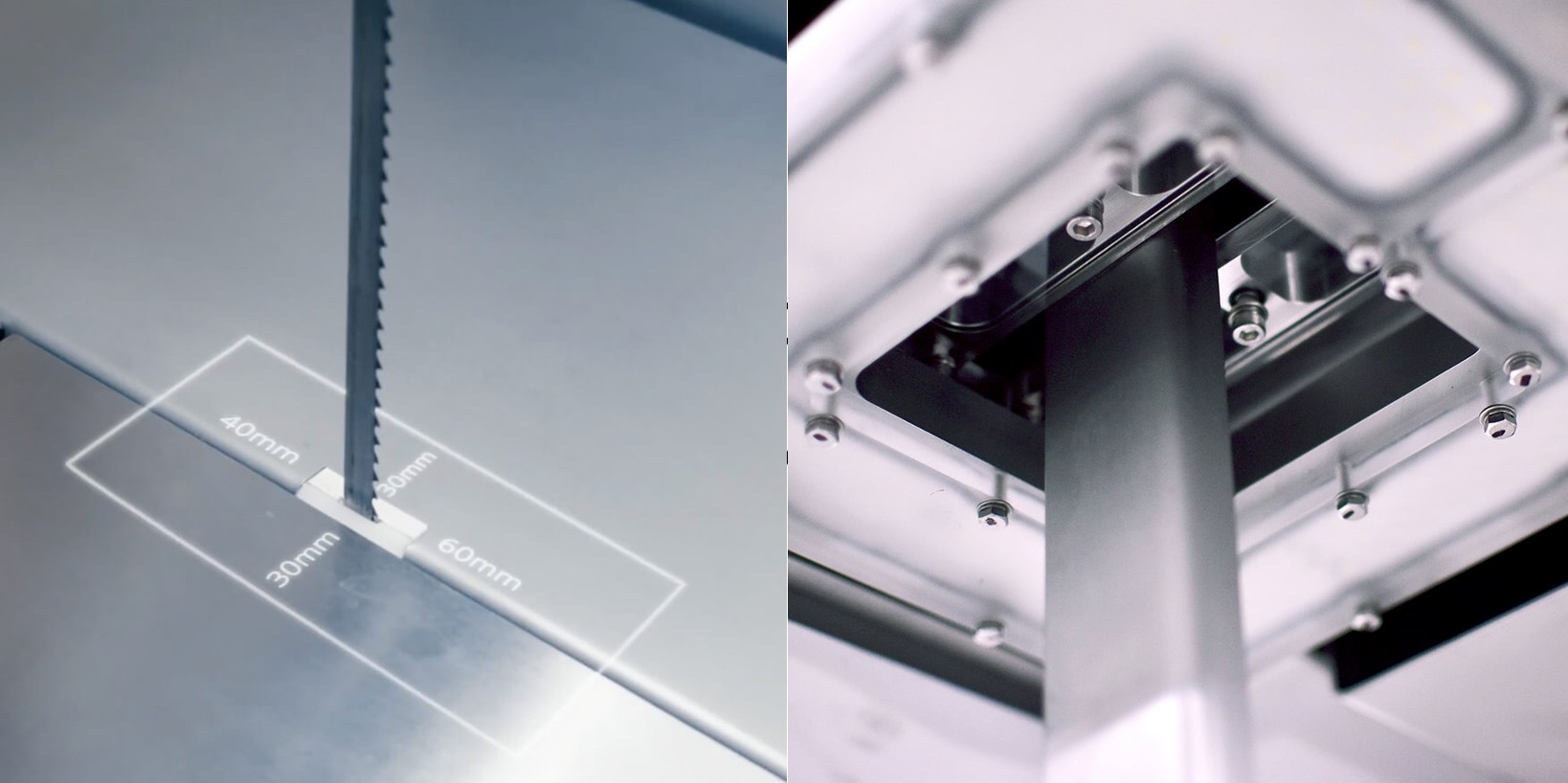 將金屬制具(內含待測樣本)由工作桌上提高左移到檯車上的底座(高度約15公分),與底座結合。單一物件總重超過15公斤以上。
